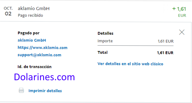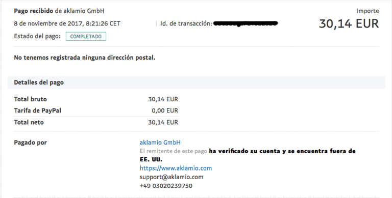 Todos los pagos en Aklamio se realizan a través de PayPal o a través de transferencia bancaria si eres un usuario con una cuenta de banco europea.
